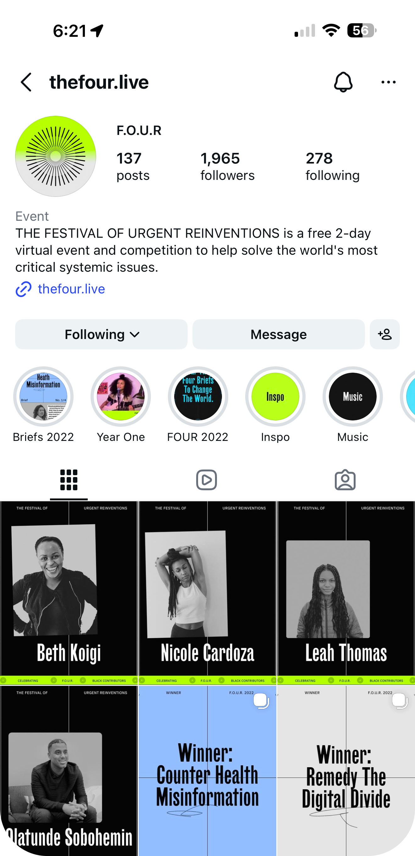 F.O.U.R. was designed as a multi-surface digital platform supporting a large-scale virtual festival centered on advocacy, participation, and collective action. The project required a flexible system capable of organizing complex, fast-changing content while remaining accessible, legible, and consistent across web, social, and physical environments.